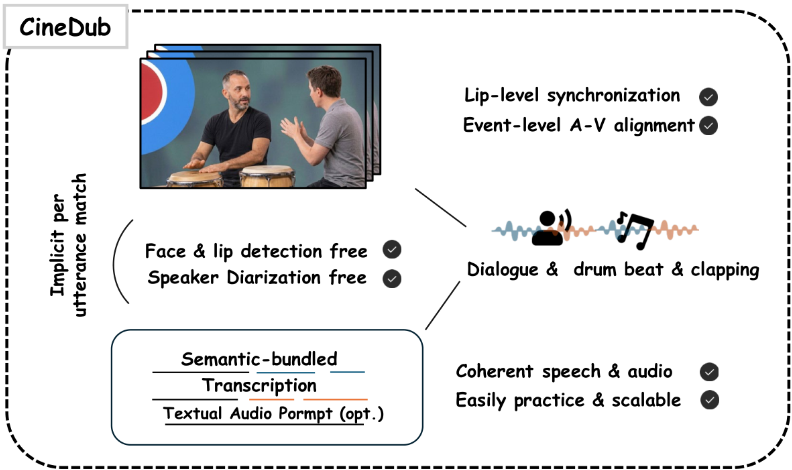 - HolisticAudio: The first scalable end-to-end cinematic dubbing model that operates on holistic video without preprocessing pipelines, jointly modeling speech, sound effects, and music across multi-speaker, off-screen, and combined generation scenarios.